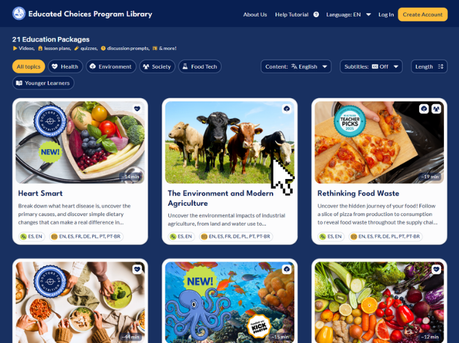 At the heart of ECP’s efforts is a free library of digital programs, including environmentally-focused packages such as “The Environment and Modern Agriculture” and “Rethinking Food Waste.” These resources help students uncover the hidden environmental costs of industrial food production — from land and water depletion to greenhouse gas emissions and biodiversity loss. Rather than prescribing a specific diet, ECP uses peer-reviewed research and engaging multimedia to spark critical thinking, allowing students to connect their daily habits to the broader health of Earth’s natural systems.